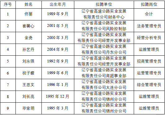 根据辽宁省高速公路实业发展有限责任公司招聘工作有关要求,经过资格审核、笔试、面试等程序,确定以下人员为辽宁省高速公路实业发展有限责任公司拟聘用人员,现予以公示。