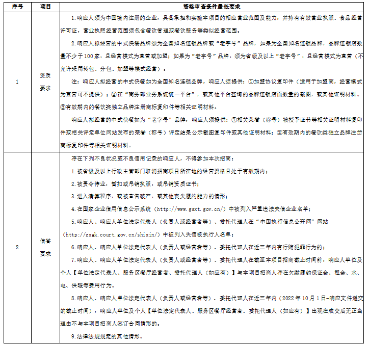 3.1本次招商要求响应人必须同时具备的资格要求详见下表: