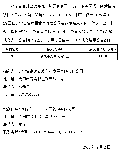 辽宁省高速公路高花、新民和康平等12个服务区餐厅经营招商项目(二次)成交结果公告